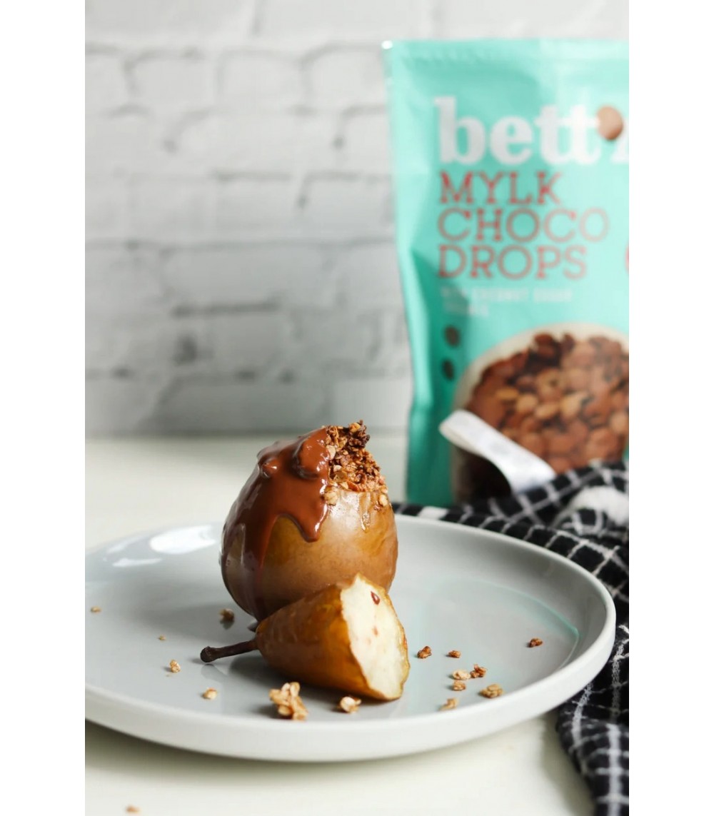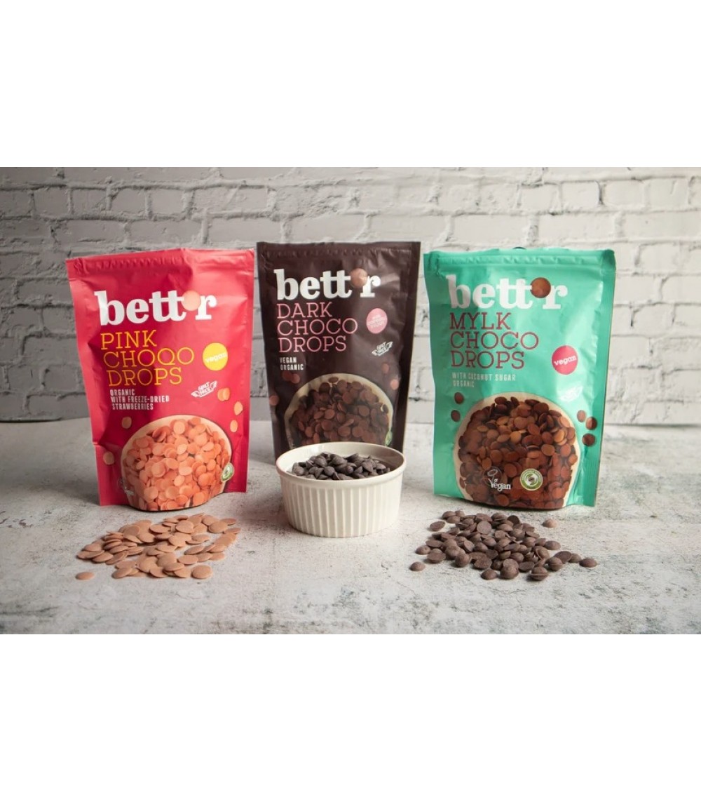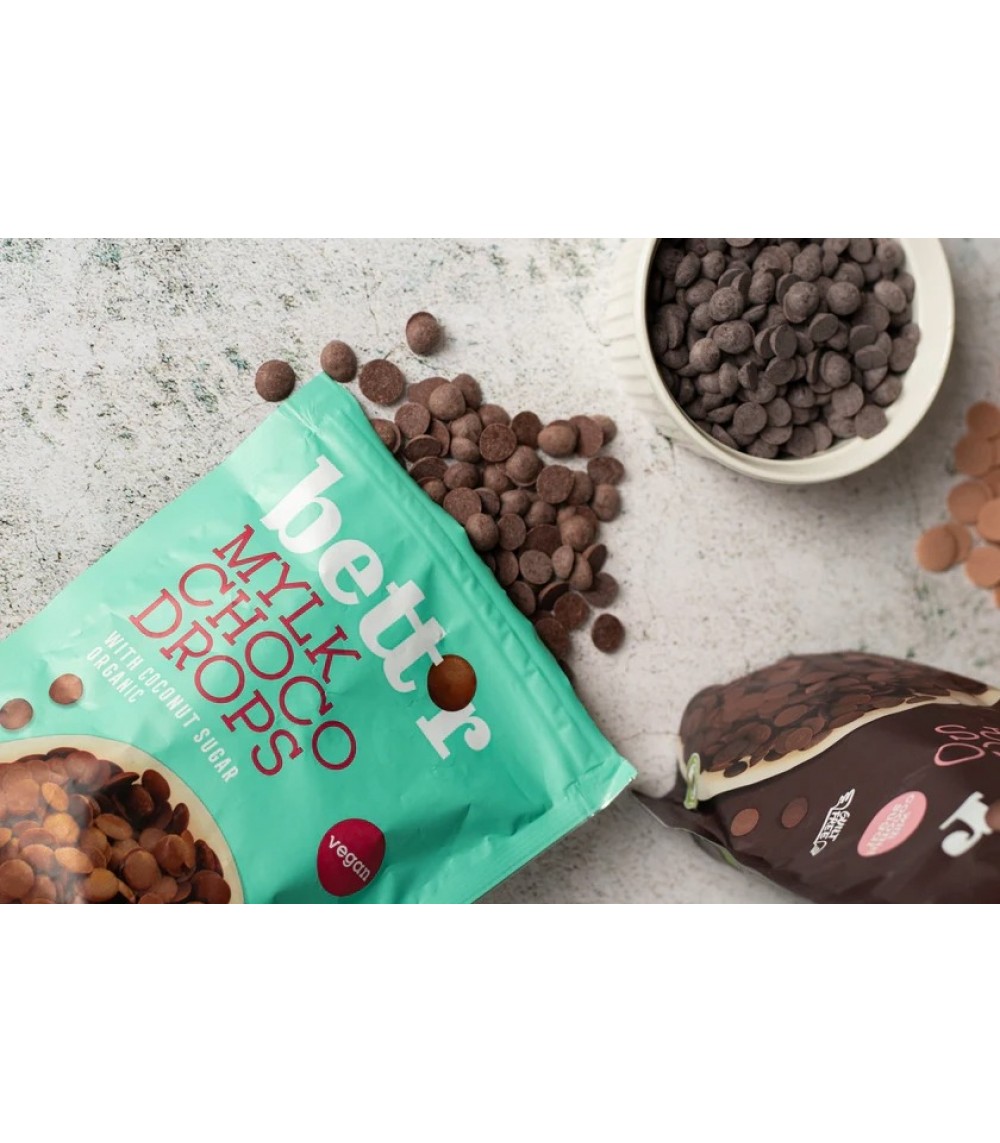 Økologiske, veganske Choco Drops Mylky fra Bett’r byder på en blød og delikat chokoladesmag — uden animalske ingredienser. Sødet med kokossukker og baseret på kokoscreme, som balancerer den fine Peruvian cacao og giver en rund og mild sødme. Perfekte til bagværk, desserter eller bare som en sundere snack.