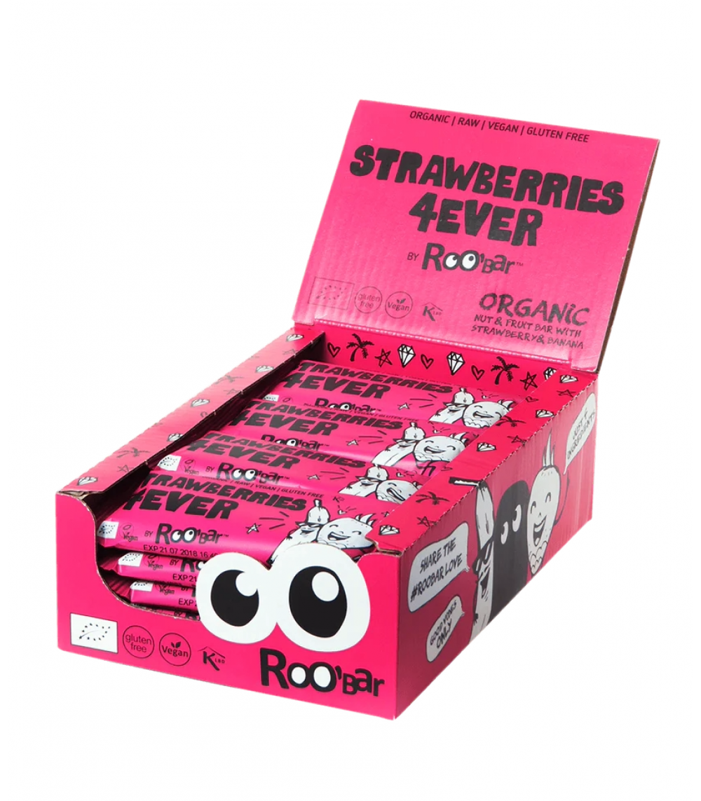 Strawberries 4Ever er en blød og fin økologisk nødde- og frugtbar med et tilpas indhold af jordbær, der gør baren til en særlig lækker og fristende sag som et mellemmåltid, en dessert, til kaffen eller i forbindelse med sport og fritidsaktiviteter samt i skole-madkassen. Jordbærrets let syrlige smag forener sig med bananens sødme til en virkelig raffineret fuldendt smags-oplevelse, der understreges og forstærkes af dadler og cashewnødder.
