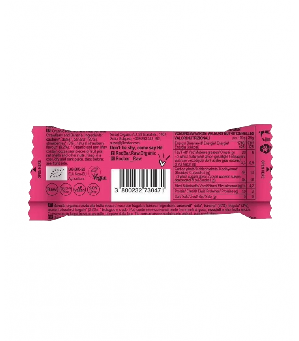 | CASHEWNØDDER*, dadler*, bananer* (20%), jordbær* (3%). *=Raw ingredienser fra Økologisk landbrug. |