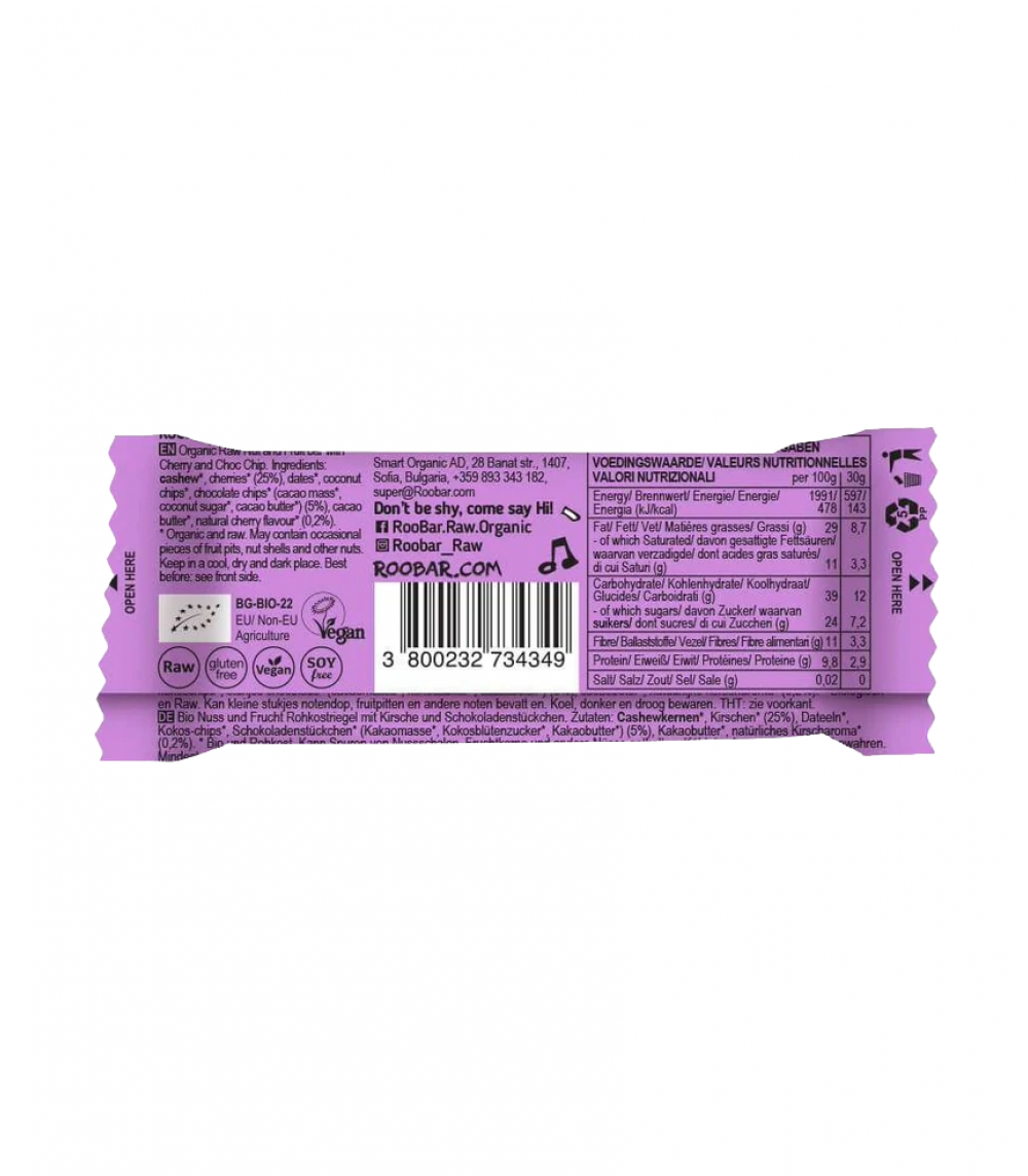 | CASHEWNØDDER*, kirsebær* (25%), dadler*, kokoschips*, chokoladestykker* (kakaomasse*, kokosblomstsukker*, kakaosmør*)(5%), kakaosmør*. *= Økologisk og raw. |
