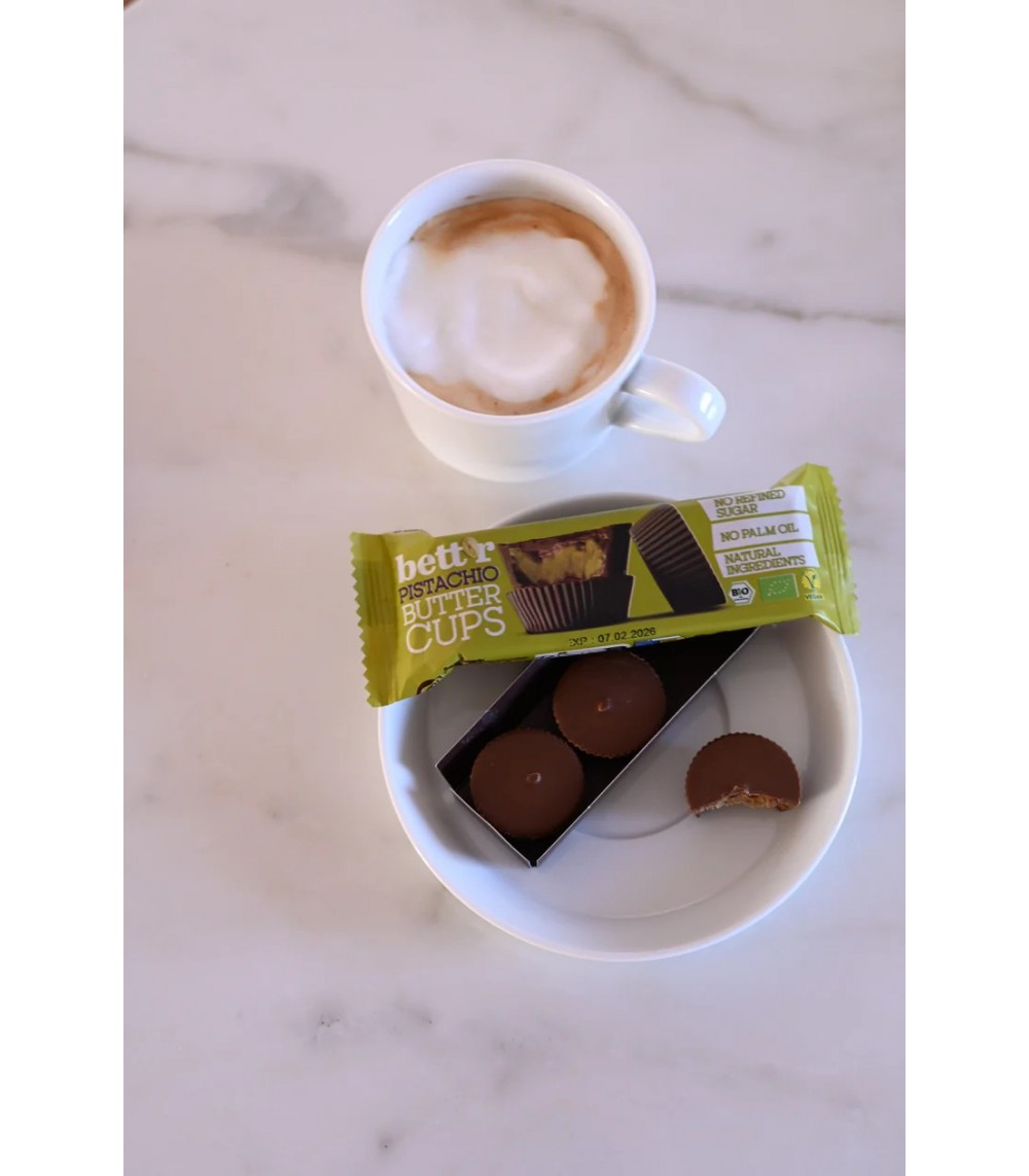 Prøv de veganske Nut Butter Cups med pistaciesmag. Et alternativ til almindelig chokolade.