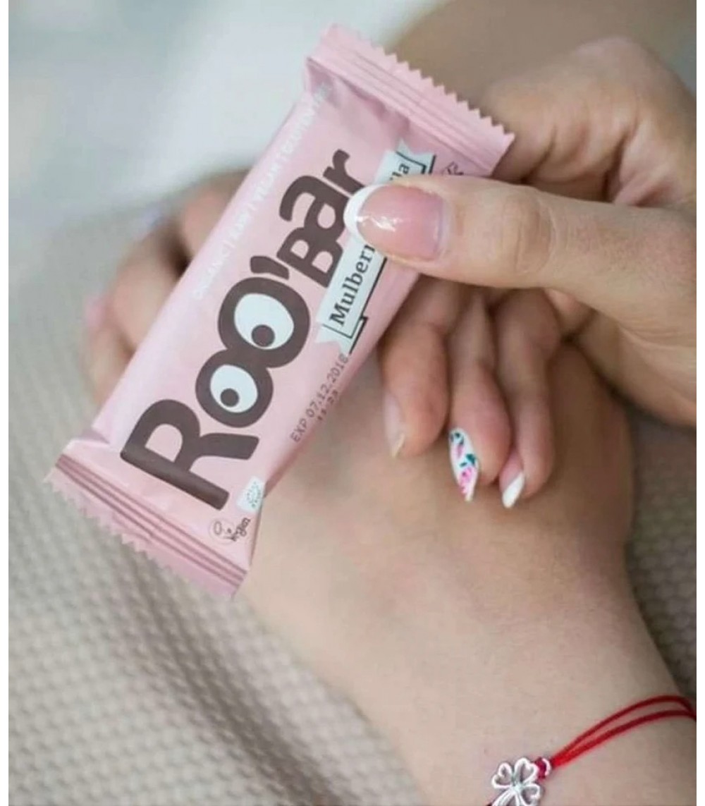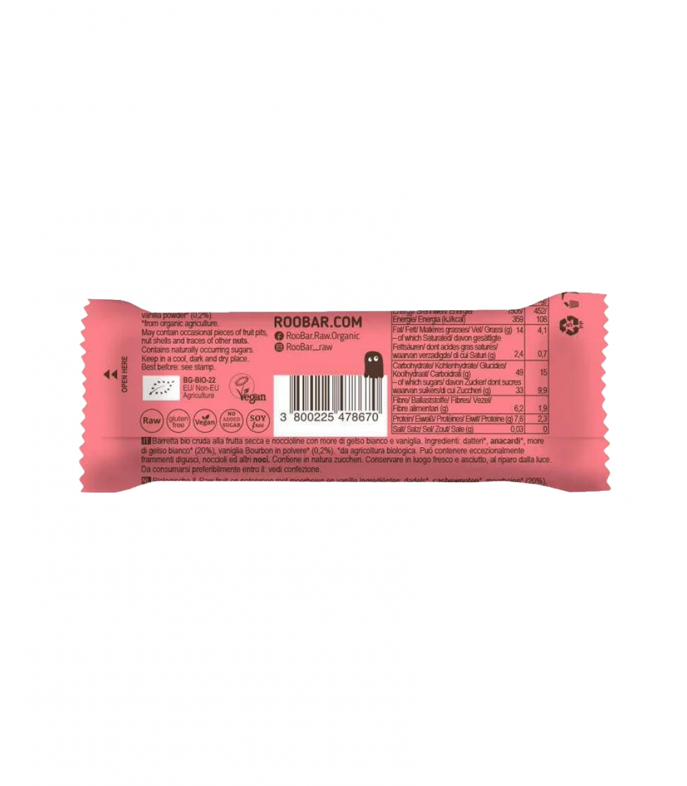 En ganske særlig mild og fin smag karakteriserer denne Roo’Bar med morbær og vanilje, hvor dadler sørger for blødheden og sødmen, mens cashewnødder tilfører den intensitet, der giver baren fylde. Serien af velsmagende frugtbarer er fremstillet ved temperaturer under 42 grader, og barerne er således 100 % raw food. Indholdet er i denne bar som i Roo’Bar generelt bær og frugter kendt under betegnelsen ”superfruit”.