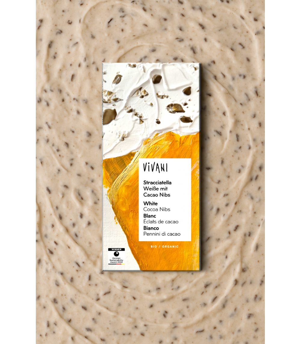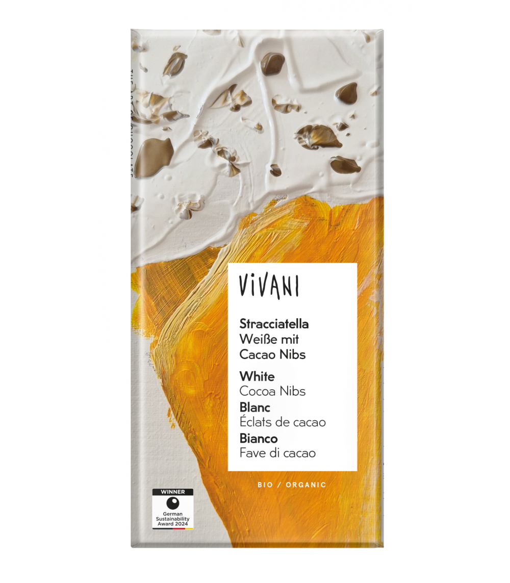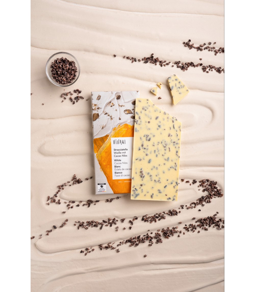 Vivani’s Stracciatella-udgave forener den cremede blødhed fra hvid chokolade med sprøde nibs af kakao — et samspil mellem det søde og det knasende, der vækker sanserne. Denne økologiske chokolade er omhyggeligt fremstillet med rene, certificerede ingredienser, der giver både dybde og finesse. Hvid chokolade base, der smelter blidt og harmonerer med kakao nibs’ let bitre og aromatiske bid.